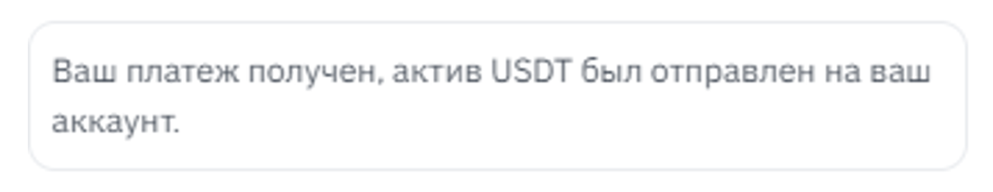 8. После подтверждения оплаты в течение 10 минут (на практике 2-3 минуты) в окне чата появится сообщение: